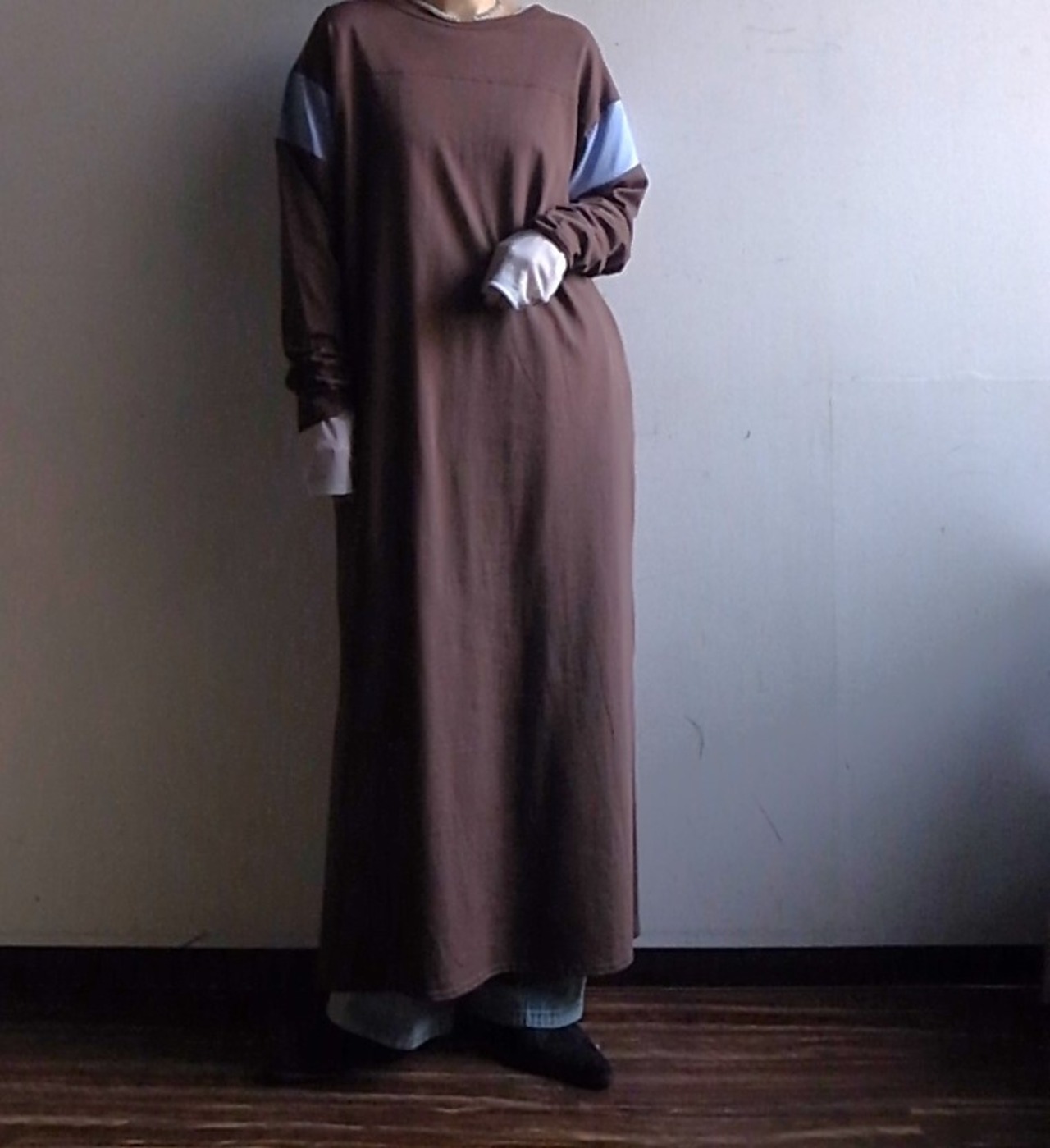 大胆なナンバープリントが目を惹くカットソー地のロングワンピース